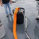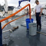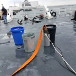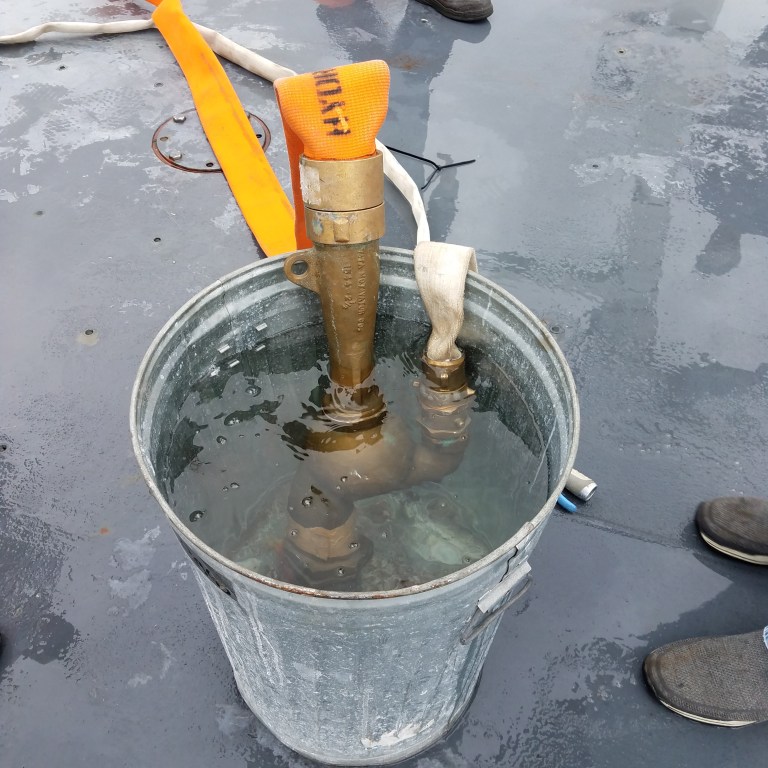 This uses the Bernoulli Principle. The Eductor is hooked up to the ship’s Fire Main System with the 1.5 inch white fire hose. Water will flow through the Eductor with a pressure of about 130psi and will discharge the water through the 2.5 inch orange hose. The flowing water through the Eductor will create the suction needed to pump out the water from the bottom of the trash can, or enclosed space filled with water. The Edutor is easy to carry and easy to set up. You can see how it works with the video below. The voice is Chief Mate Michael Coulbourne.